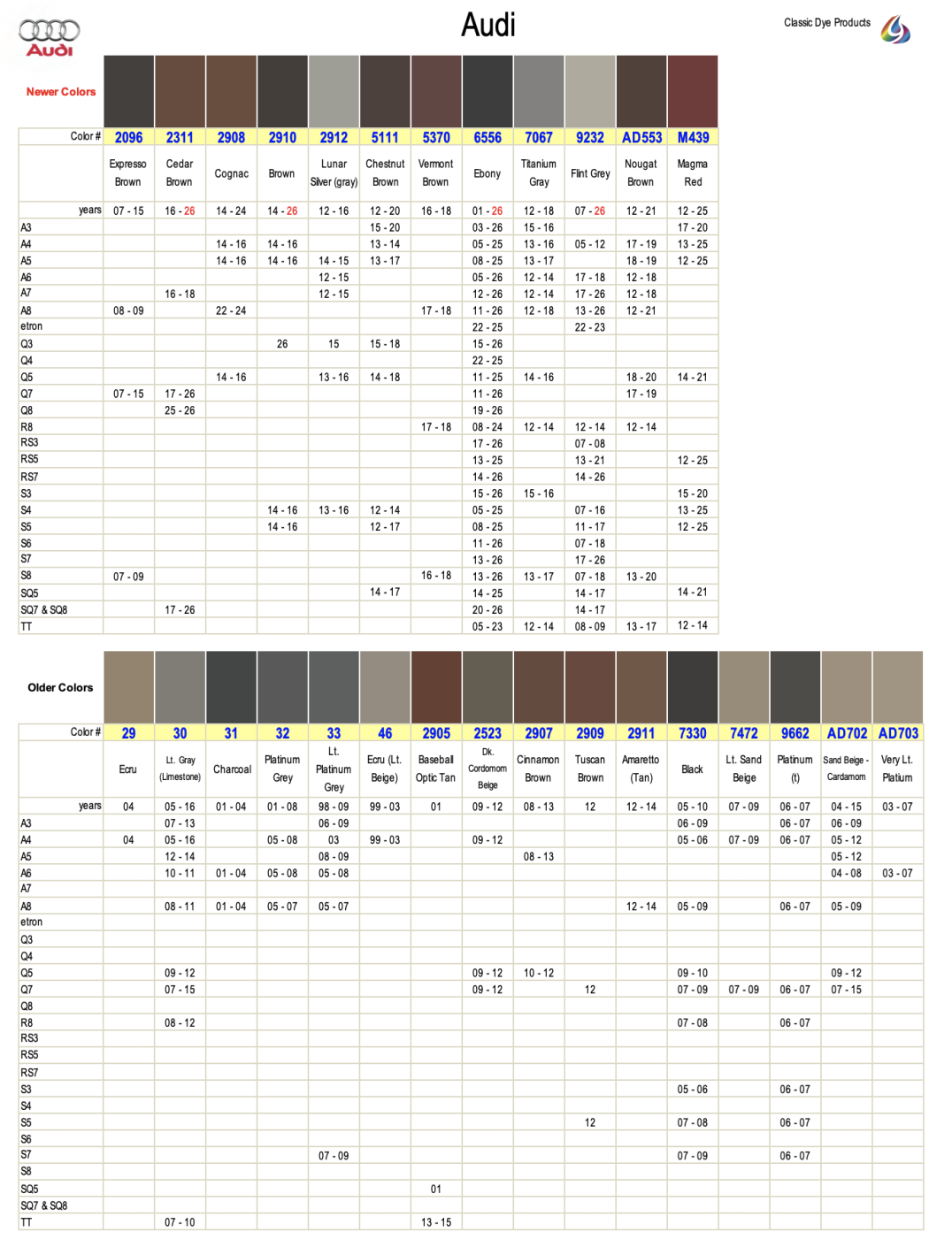 Audi leather & vinyl dye colors are matched to the OEM color name. Find colors by year, make & model. Easily restore & repair the original color for DIY application.