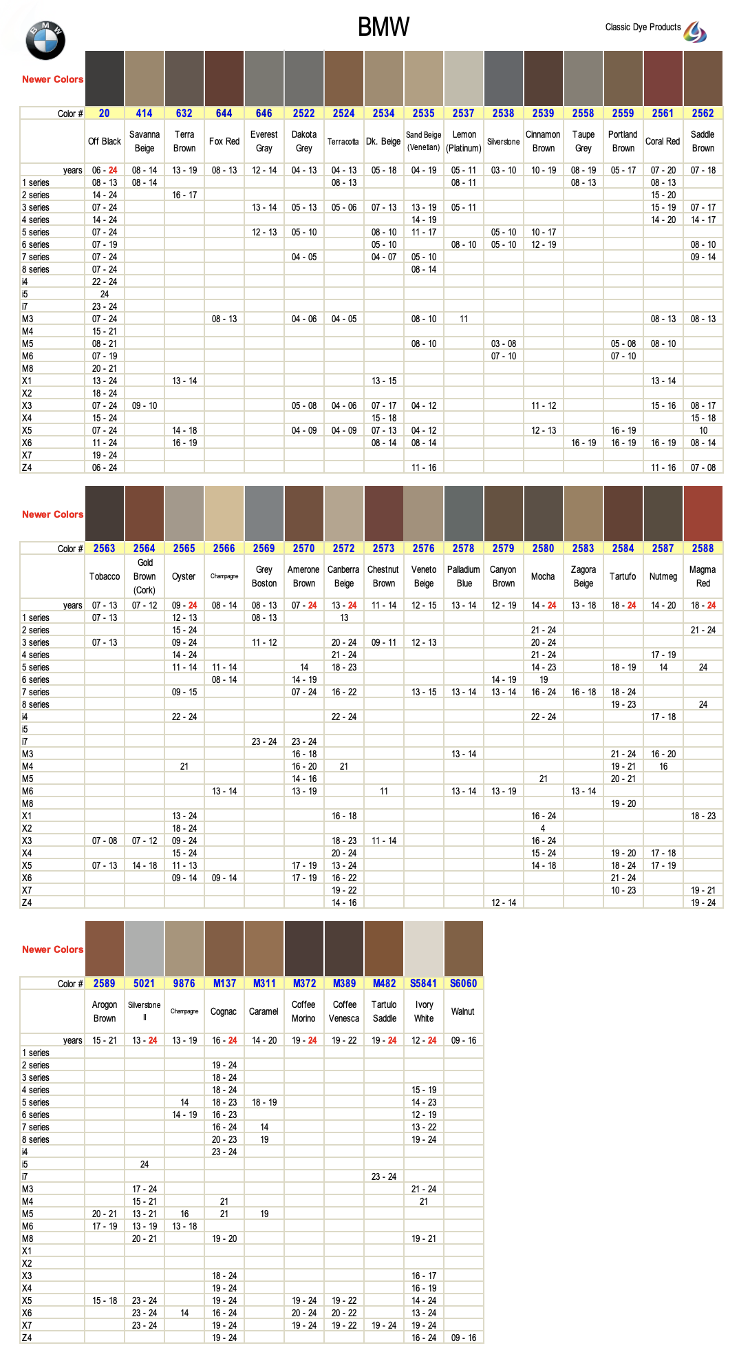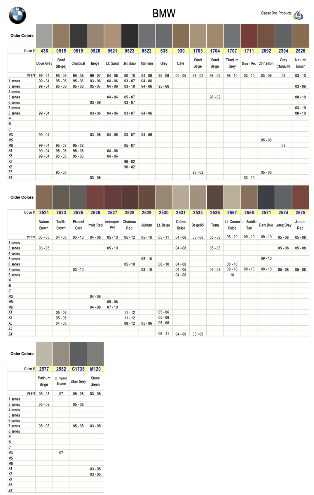 BMW leather & vinyl dye colors are matched to the OEM color name. Find colors by year, make & model. Easily restore & repair the original color for DIY application.