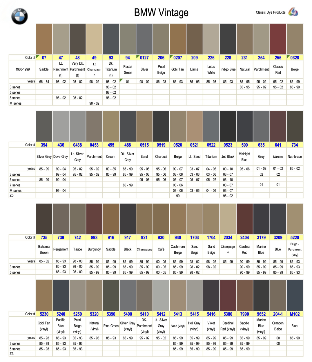 BMW vintage leather & vinyl dye colors are matched to the OEM color name. Find colors by year, make & model. Easily restore & repair the original color for DIY application.