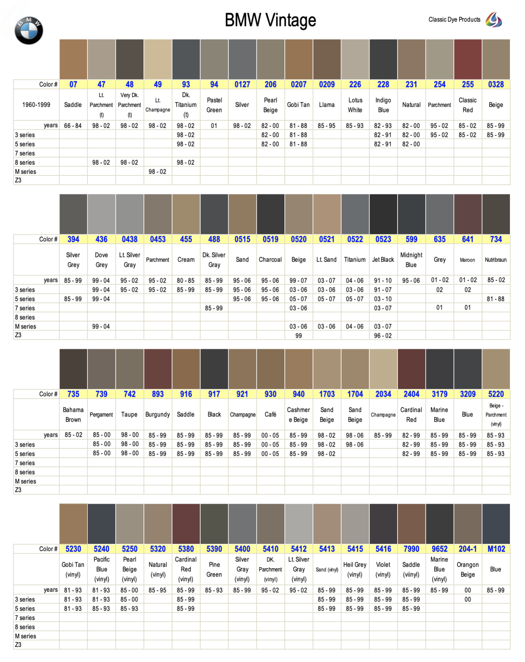 BMW vintage leather & vinyl dye colors are matched to the OEM color name. Find colors by year, make & model. Easily restore & repair the original color for DIY application.