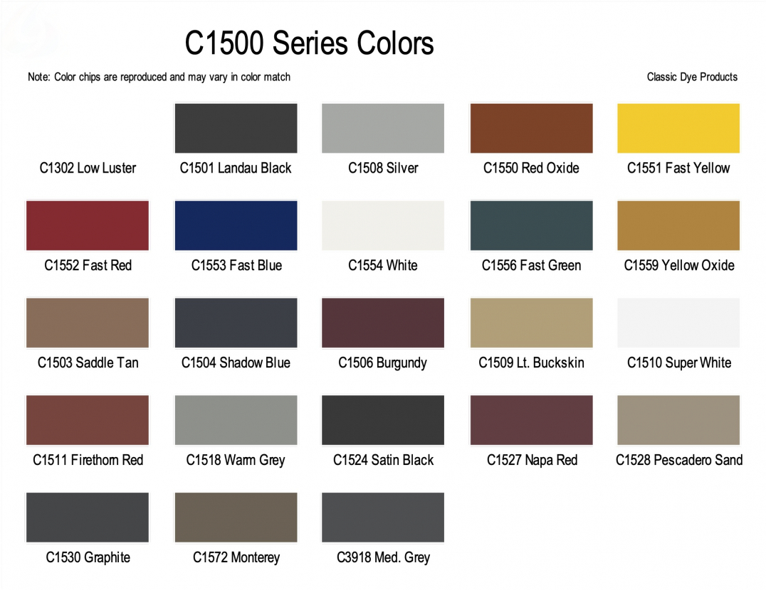 C1302 Low Luster, C1501 Landau Black, C1508 Silver, C1550 Red Oxide, C1551 Fast Yellow, C1552 Fast Red, C1553 Fast Blue, C1554 White, C1556 Fast Green, C1559 Yellow Oxide