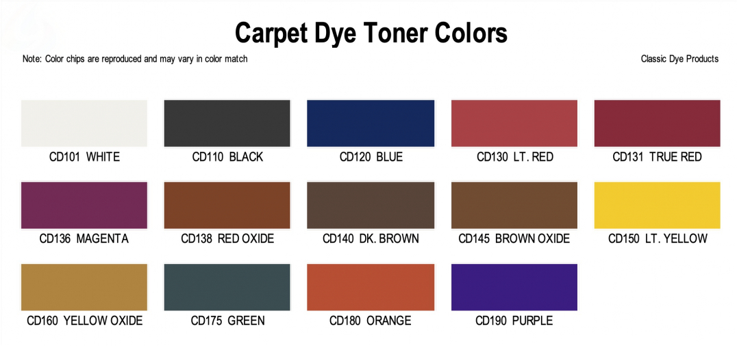 Pre-mixed combination of tinting pigments (primary colors) formulated in Carpet Clear Base.