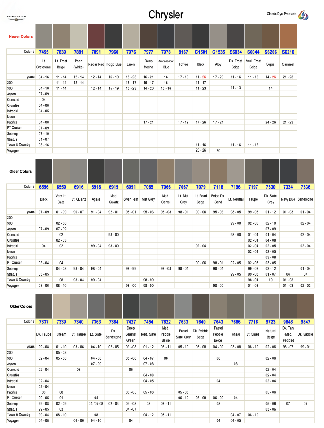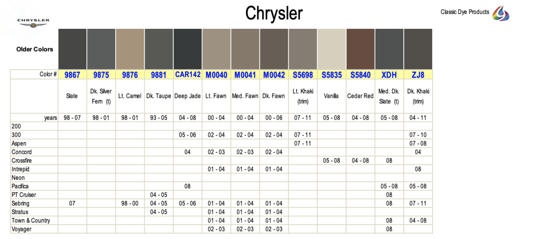 Chrysler leather & vinyl dye colors are matched to the OEM color name. Find colors by year, make & model. Easily restore & repair the original color for DIY application.