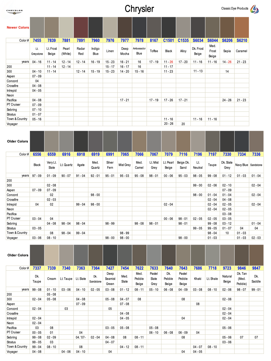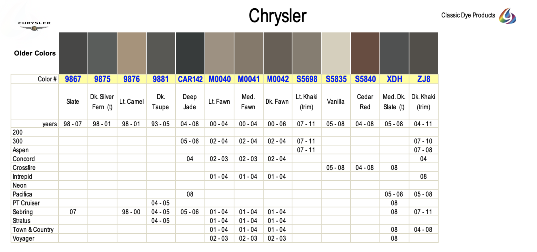 Chrysler leather & vinyl dye colors are matched to the OEM color name. Find colors by year, make & model. Easily restore & repair the original color for DIY application.