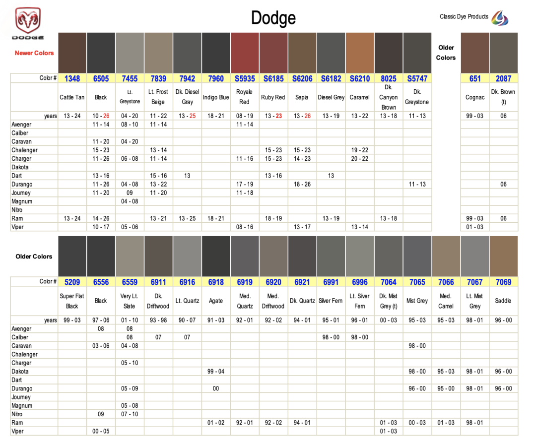 Dodge leather & vinyl dye colors are matched to the OEM color name. Find colors by year, make & model. Easily restore & repair the original color for DIY application.