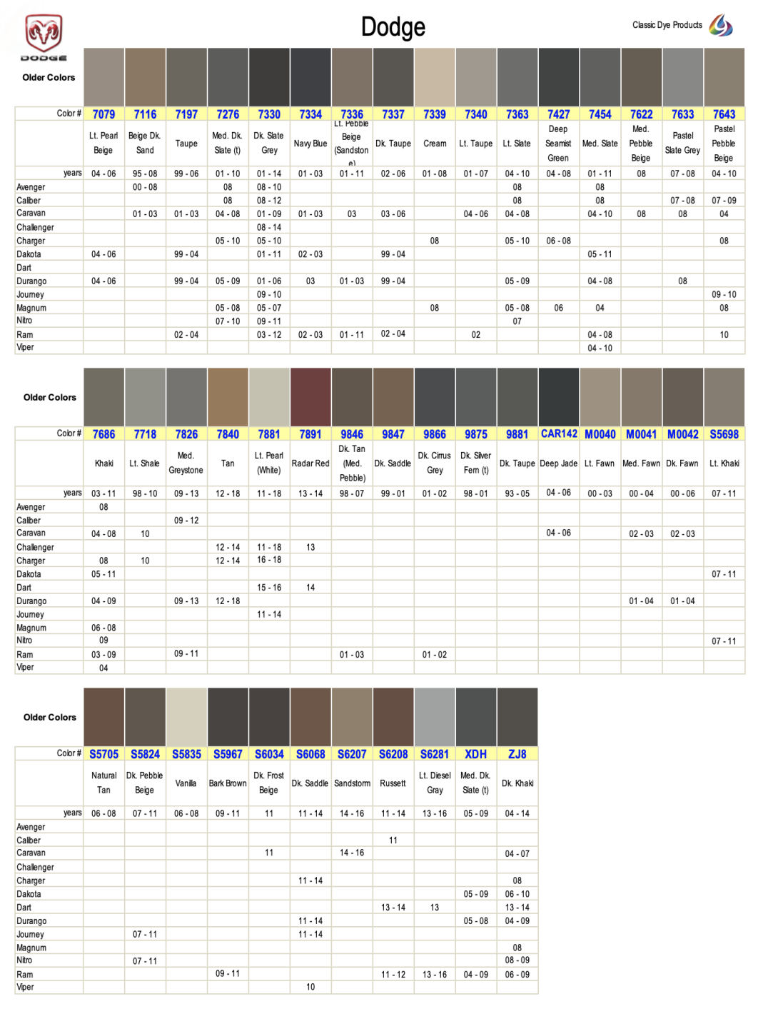 Dodge colors, Dodge color chart