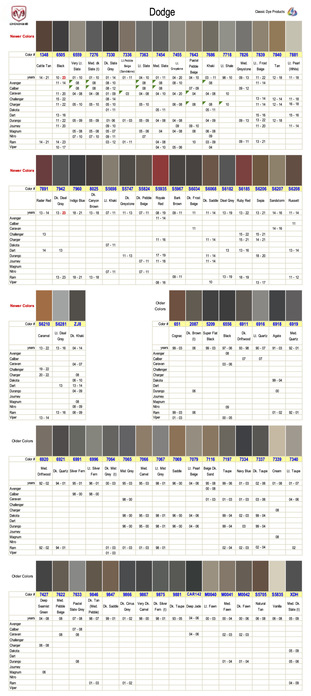 Dodge leather & vinyl dye colors are matched to the OEM color name. Find colors by year, make & model. Easily restore & repair the original color for DIY application.