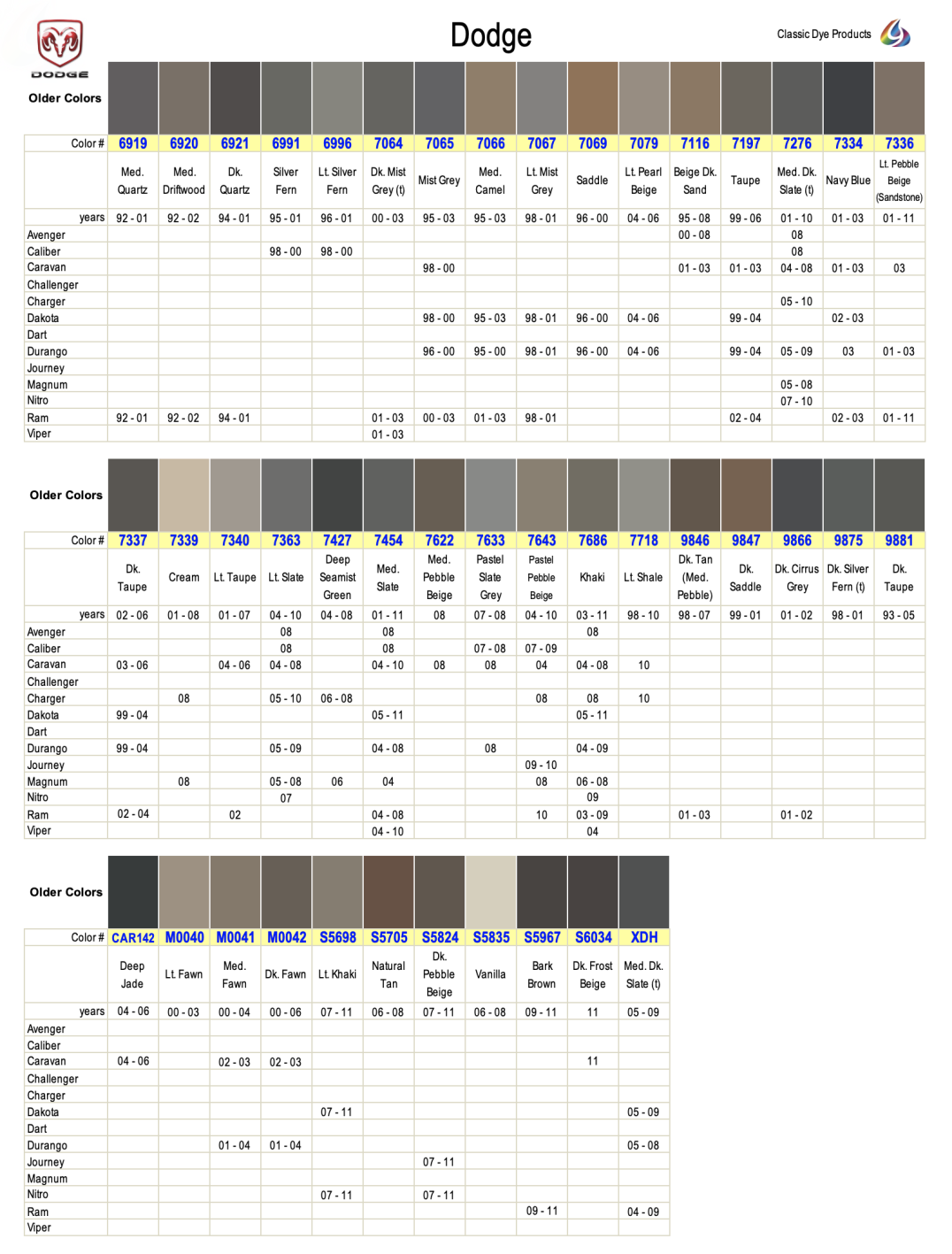 Dodge leather & vinyl dye colors are matched to the OEM color name. Find colors by year, make & model. Easily restore & repair the original color for DIY application.