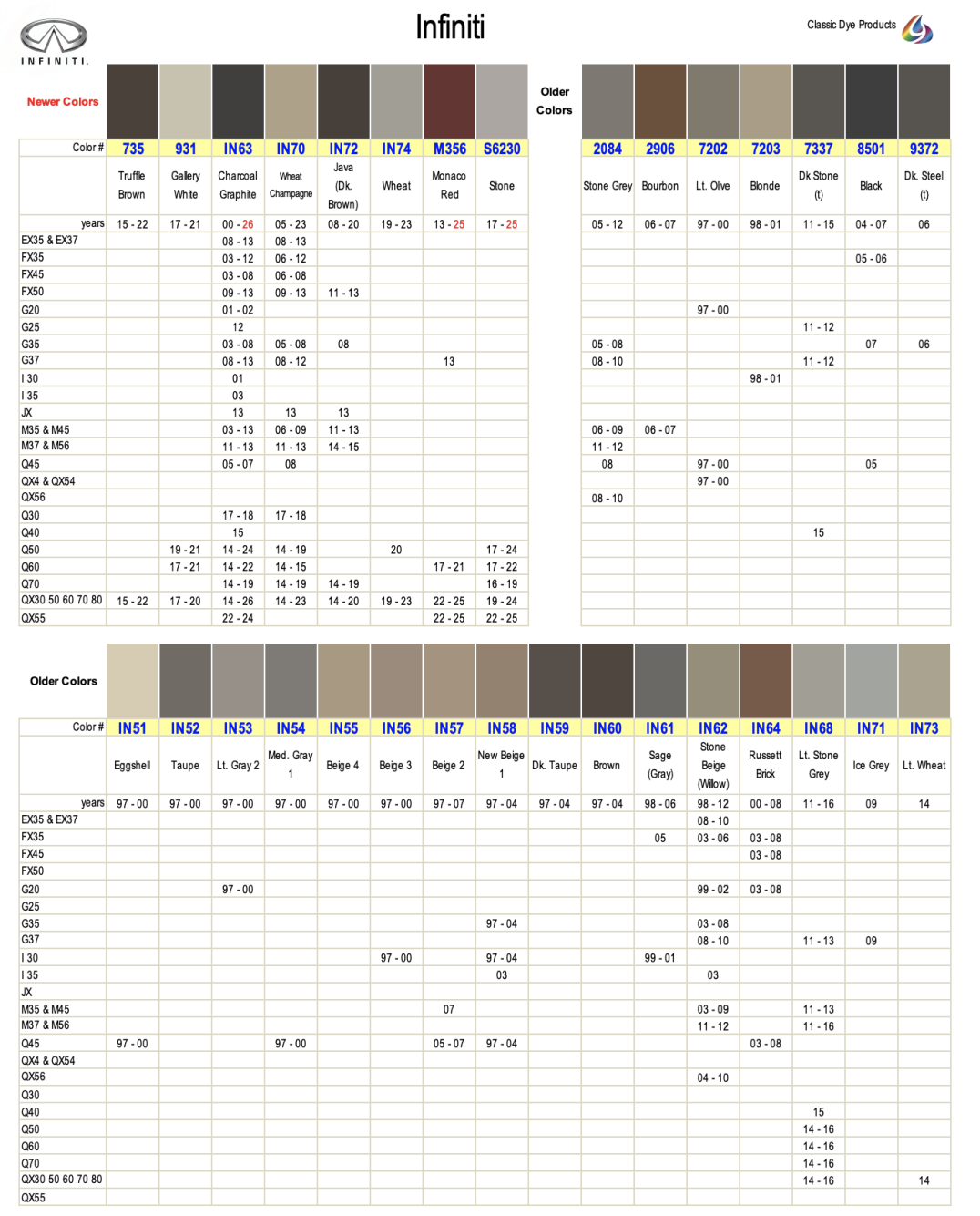 Infiniti leather & vinyl dye colors are matched to the OEM color name. Find colors by year, make & model. Easily restore & repair the original color for DIY application.