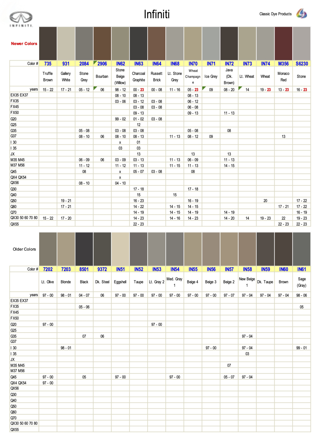 Infiniti leather & vinyl dye colors are matched to the OEM color name. Find colors by year, make & model. Easily restore & repair the original color for DIY application.