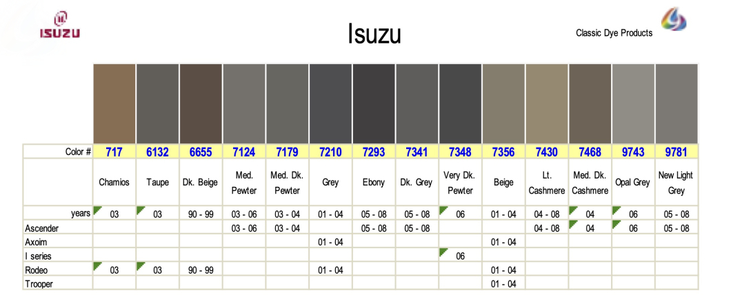 Isuzu leather & vinyl dye colors are matched to the OEM color name. Find colors by year, make & model. Easily restore & repair the original color for DIY application.