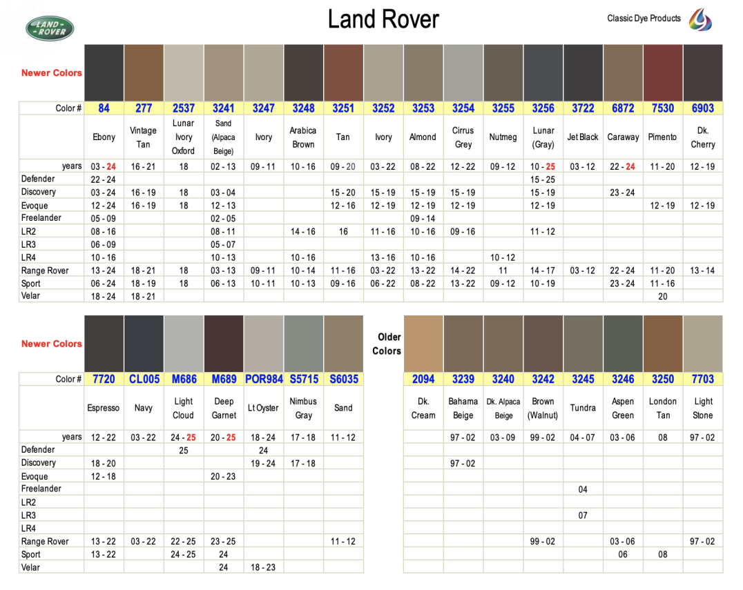 Land Rover leather & vinyl dye colors are matched to the OEM color name. Find colors by year, make & model. Easily restore & repair the original color for DIY application.