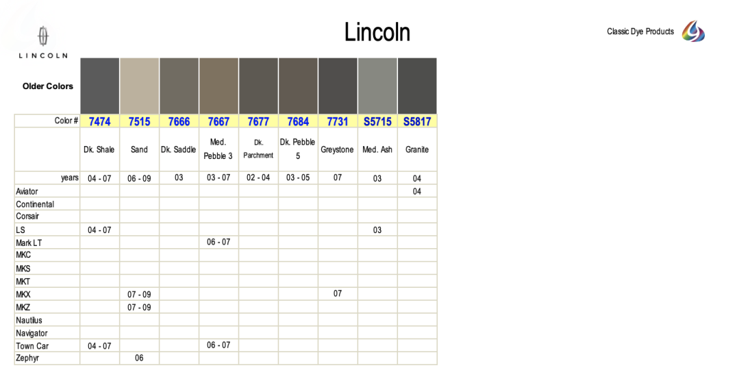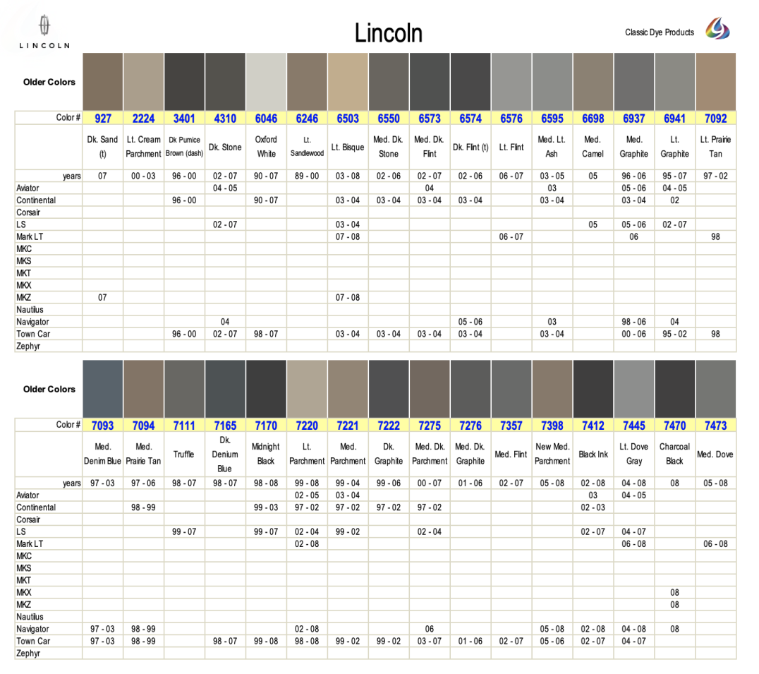 Lincoln leather & vinyl dye colors are matched to the OEM color name. Find colors by year, make & model. Easily restore & repair the original color for DIY application.