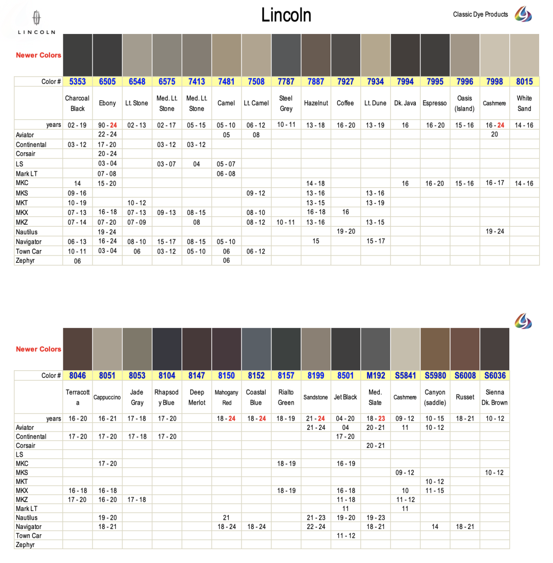 Lincoln leather & vinyl dye colors are matched to the OEM color name. Find colors by year, make & model. Easily restore & repair the original color for DIY application.