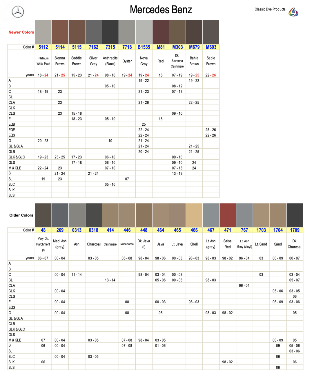 Mercedes Benz leather & vinyl dye colors are matched to the OEM color name. Find colors by year, make & model. Easily restore & repair the original color for DIY application.