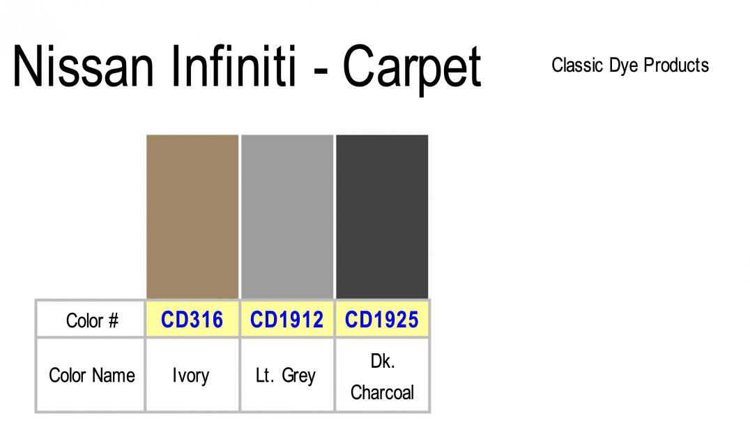 DESCRIPTION: Nissan/Infiniti Carpet Dye Colors for easy application.