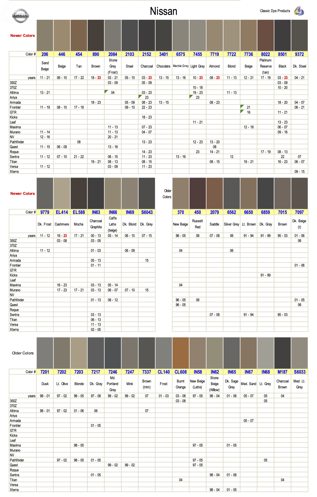 Nissan leather & vinyl dye colors are matched to the OEM color name. Find colors by year, make & model. Easily restore & repair the original color for DIY application.