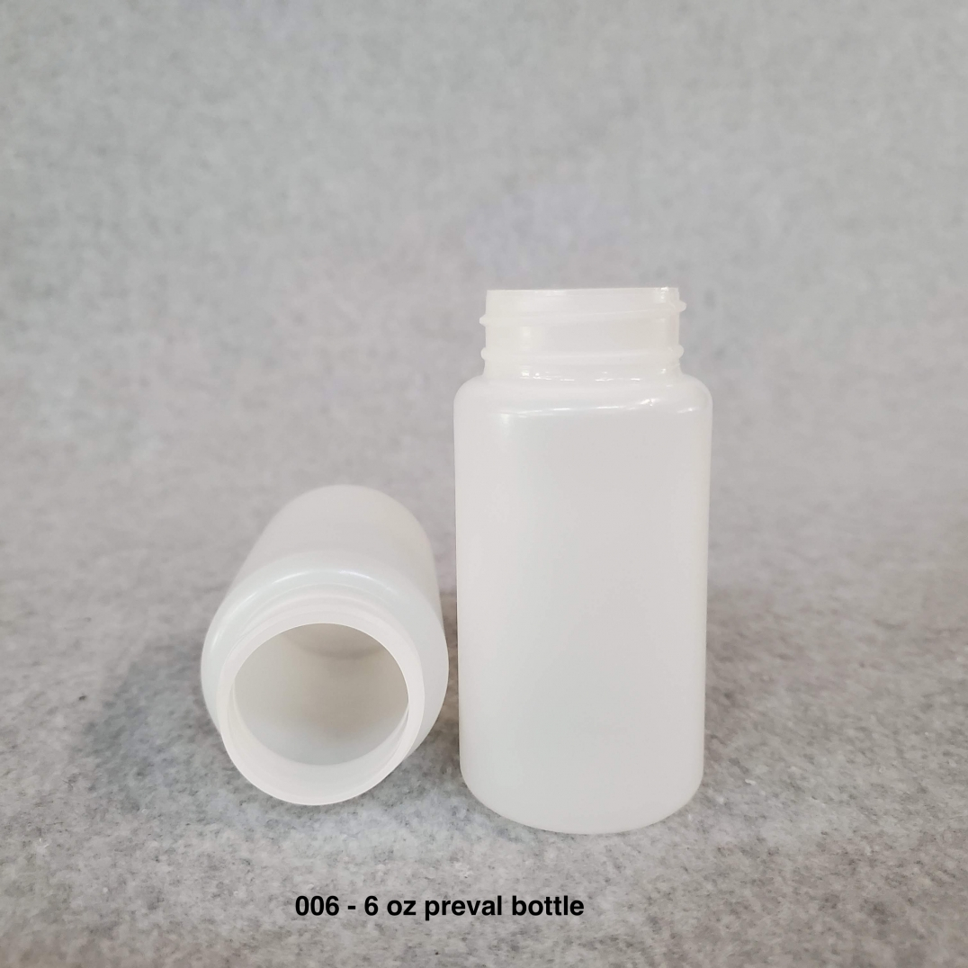 4 oz. or 6 oz. natural plastic round bottle with cap. Fits preval sprayer.