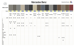 Mercedes Benz leather & vinyl dye colors are matched to the OEM color name. Find colors by year, make & model. Easily restore & repair the original color for DIY application.